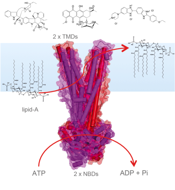Active substrate transport across the membrane requires highly specialized transport proteins. Especially intriguing is the phenomenon of multidrug efflux: Certain transporters are able to translocate a multitude of toxic compounds across the cell membrane. Besides of secondary transporters such as EmrE, we are mainly interested in ABC transporters like LmrA and MsbA. All ABC transporters show a similar modular topology with two highly conserved nucleotide binding domains for ATP hydrolysis and two transmembrane domains, which are specialized towards substrate binding and translocating. The open questions to which solid-state NMR will contribute, address the details of ATP hydrolysis, of substrate binding/recognition/release and NBD-TMD crosstalk. Our experimental approach couples time-resolved MAS-NMR for kinetic studies, DNP for trapping catalytic intermediate states with high field MAS-NMR for obtaining structural data.
