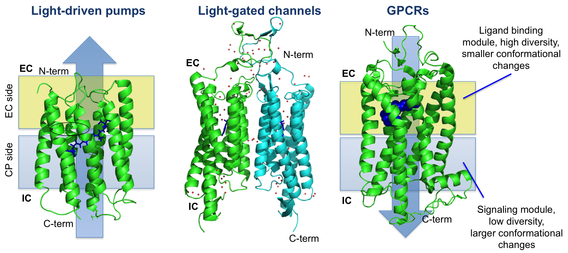 Membrane proteins with seven transmembrane helices are found in all kingdoms of life and are involved in signaling (GPCRs) and, in case of the retinal-binding subgroup, also include light-driven ion pumps or light-gated ion channels. Especially in the case of retinal-binding proteins, it is intriguing to see how evolutionary distinct proteins fulfill different functions based on an apparently similar molecular architecture. Proteorhodopsin is the most abundant retinal protein in earth and acts as a proton pump, while KR2 is a first discovered Na-pump. We apply solid-state NMR to understand color tuning, ion selectivity and, especially in case of KR2, how the photocycle is linked to ion recognition and translocation. In case of channel rhodopisn 2, we aim at resolving the link between photocycle and channel gating.