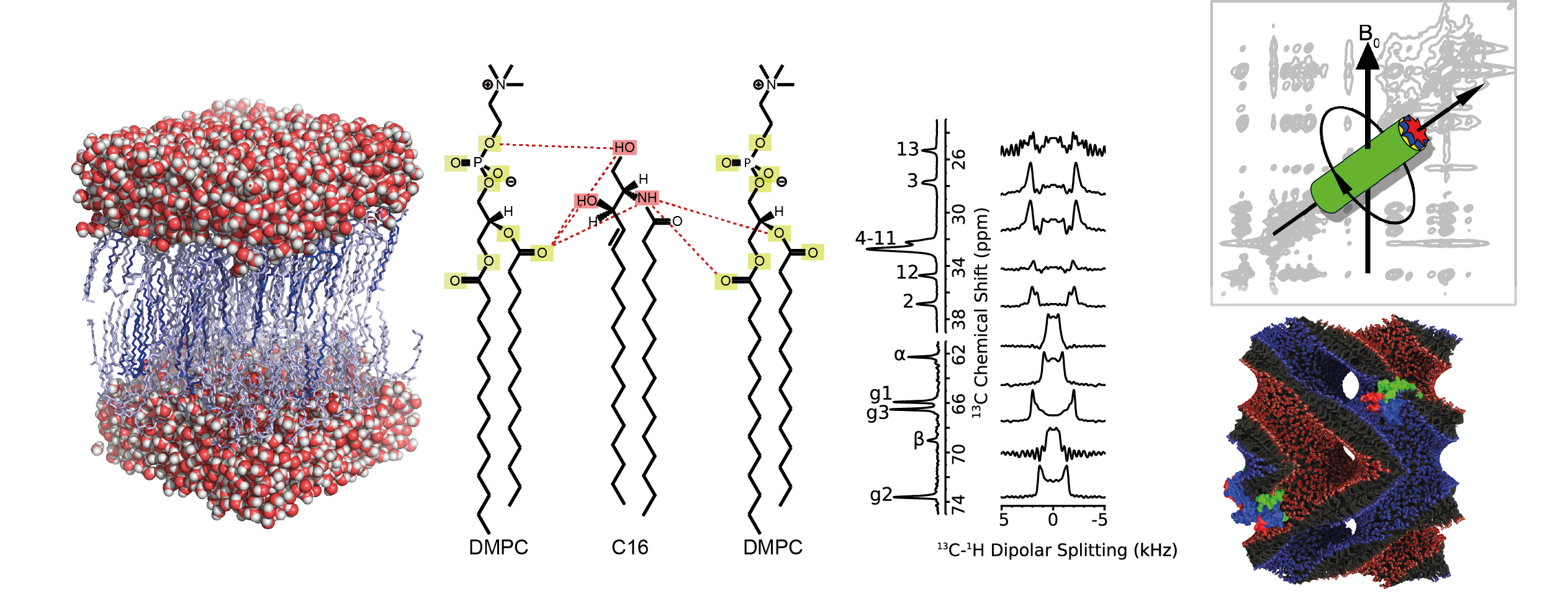 The physical properties of the lipid bilayer can be affected/modified by membrane proteins and/or low molecular weight membrane components and feed back onto the mechanism of membrane-embedded proteins. They are furthermore important for understanding phenomena such as membrane fusion, budding etc. Using solid state NMR, the interaction between drugs and lipids, cholesterol, ceramides and other components is investigated. Phases and polymorphism (bilayer, non-bilayer phase, cubic phases etc.) can be probed in terms of order and dynamics. Data can be linked with MD simulation and cellular, functional data.